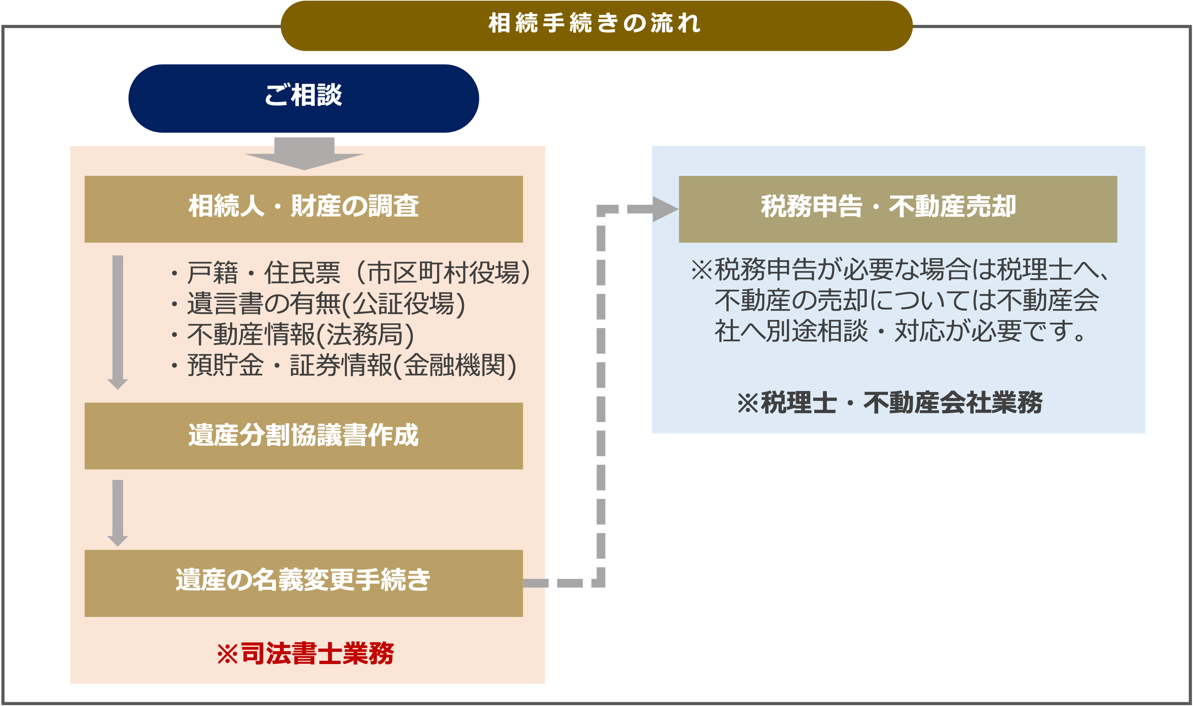その後、遺産分割協議書(相続人間での財産分割を確定させる)を作成し、名義変更手続きを行い司法書士の手続きは完了となります。別途、相続税の税務申告が必要な場合は税理士の業務となり、また不動産売却を行う場合は不動産会社が対応を行っていきます。